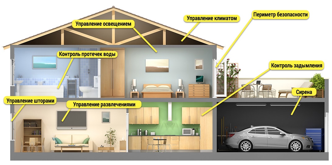 Первый вариант включает в себя все системы, которые управляются домом, т.е. отвечают за состояние дома. Чаще всего такие системы отделены друг от друга и никак не влияют на совместную работу. Кроме того, стоит отметить, что чем больше таких систем, тем сложнее их объединить и заставить работать в одном режиме.